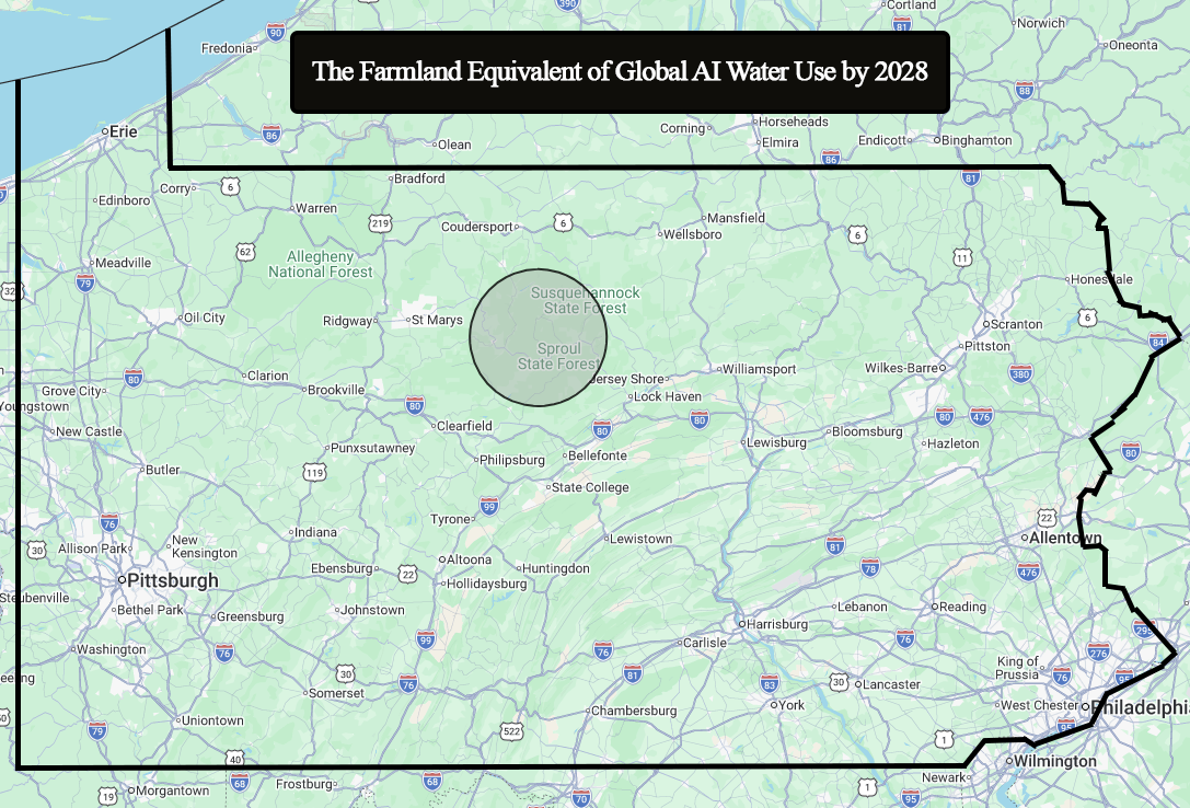 A thousand square miles is not trivial on a map. Centered on Pennsylvania, it covers a visible chunk of the state (2.2%). The real figure, 891.7 square miles of irrigated farmland, would demonstrate less. This represents the entire world's projected AI water demand, not a single state's or a single facility's.